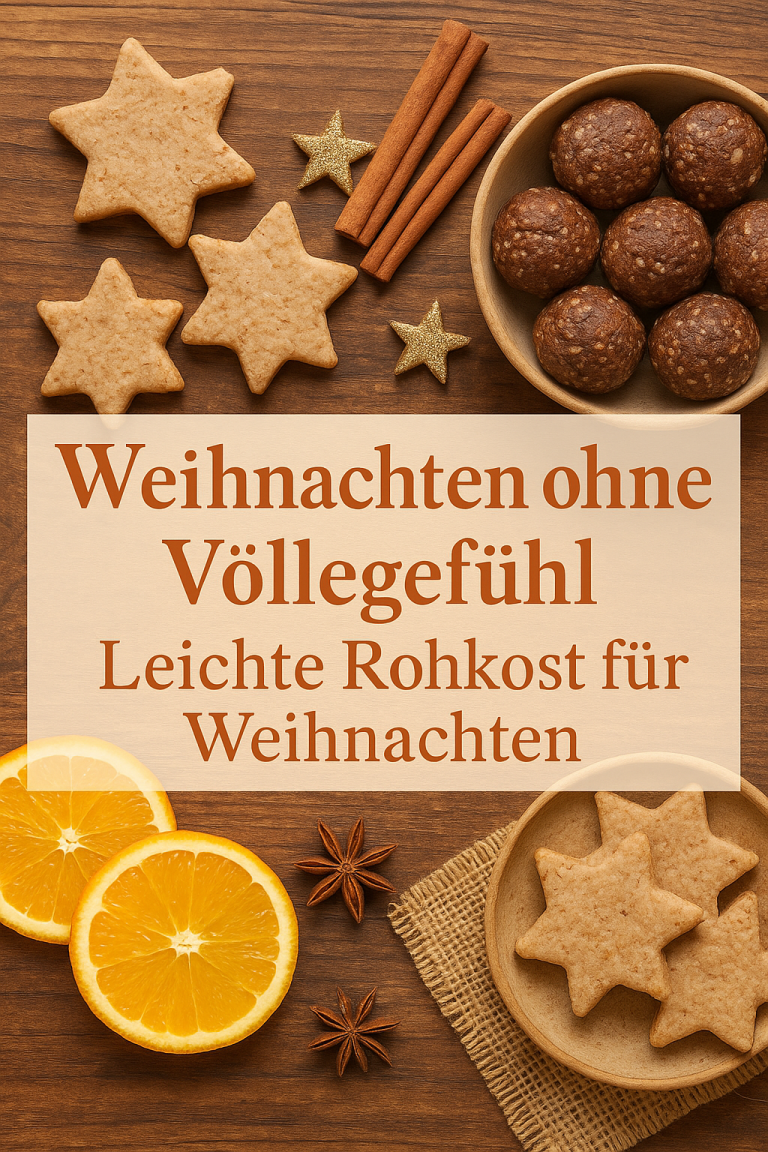 Fühl dich an Weihnachten energiegeladen statt müde! Entdecke festliche Rohkost-Ideen mit Zimt, Schokolade & Kokos – köstlich, gesund und ganz einfach zuzubereiten.